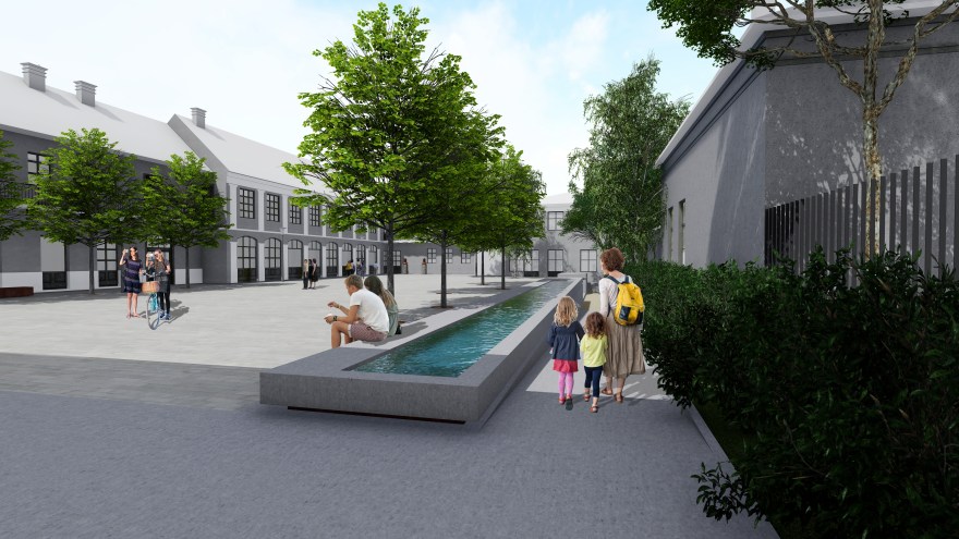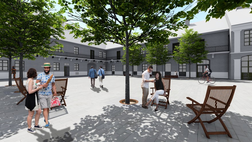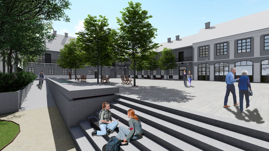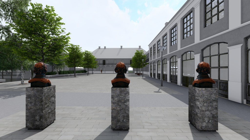 Stoga je ovim figurama u konceptu prostora pristupljeno na različiti način. Trojica administratora grupisana su u kompoziciju tri biste, postavljenu u čelo trga. Biste su naglašene i trakom u popločanju, kao i ekspresivnim masivnim postamentima. Ovakvim tretmanom odaje se pošta Francu Jozefu Redlu, Paulu Krušperu i Mihailu Irmenjiju na podjednak način, obzirom da su i po funkciji imali isti značaj. Ova kompozicija predstavlja vizuelni kulminaciju čela trga, i aktivira ga, a vidljiva je i kroz prolaz sa Trga Svetog Trojstva, i predstavlja dodatni vizuelni atrakter za prolaznike.