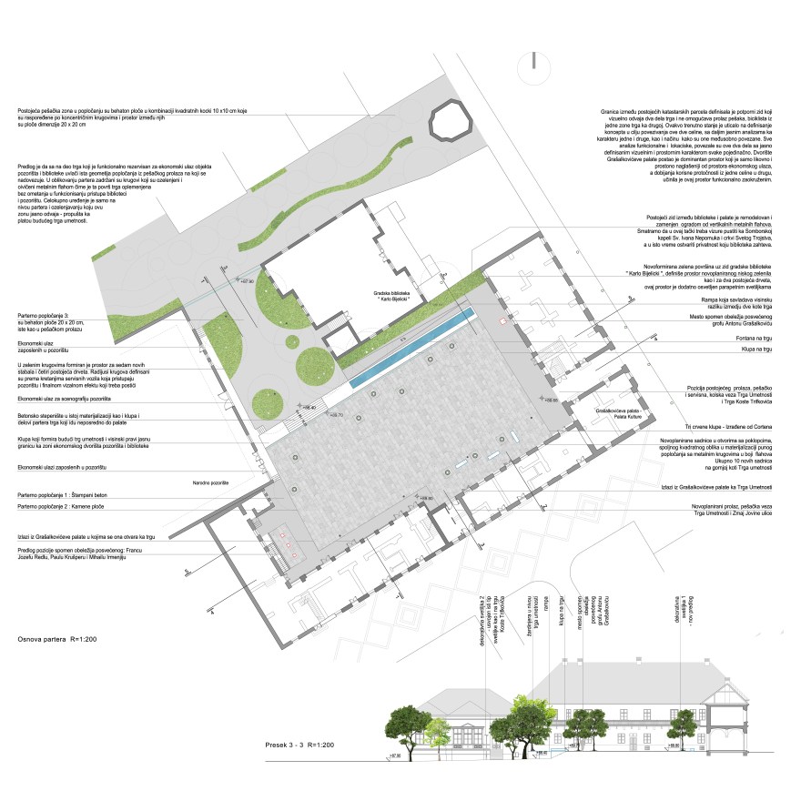 Projekat postavlja liniju denivelacije tako da prostor koji nivelacijski i formalno pripada Palati kulture ima što čistiji i jasniji geometrijski oblik, dodatno naglašavajući klasicistički karakter, sasvim u skladu sa istorijskom arhitekturom koja ga okružuje. Vertikalne komunikacije – stepenice i rampa, grupisane su u fiksni linijski element koji funkcionalno i formalno deli prostor na dva dela: na prostor Trga umetnosti, i na prostor kojim se pristupa Biblioteci i Pozorištu. U tom linijskom elementu savladana je kompletna visinska denivelacija, čime su 2 dela predmetnog prostora dodatno razdvojena. “Donji deo”, odnosno prostor sa koga se pristupa službenim ulazima Pozorišta i Biblioteke, time je nivelisan sa već uređenim prolazom pored Maksija, dok je “gorni deo” u nivou sa Palatom Kulture.