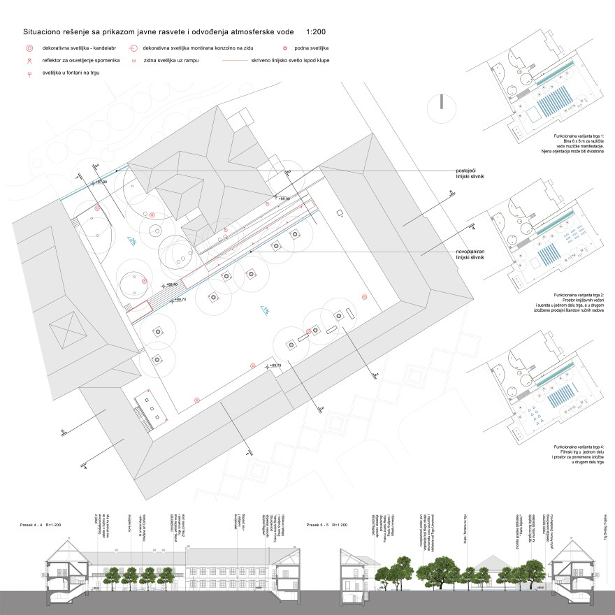 Jednostavan i klasičan tretman Trga omogućava njegovu multifunkcionalnost u skladu sa zahtevima konkursa: moguće je postavljanje bine i gledališta u nekoliko konfiguracija na trgu. Pored toga, sklopivim i pomerljivim urbanim mobilijarom trg može poprimati različite ambijentalne i funkcionalne kvalitete, u zavisnosti od potreba korisnika i građana Sombora.