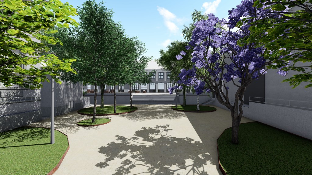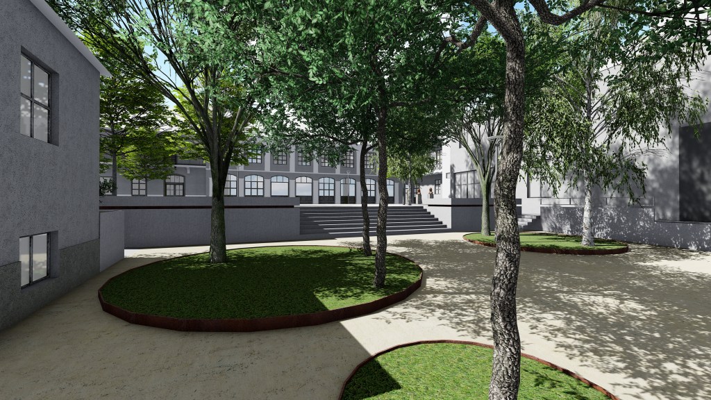 Nova i postojeća stabla koja se zadržavaju su postavljena u nezastrte otvore. U donjem delu zelene površine su velikih prečnikasa ivičnjakom od kortena i služe za oblikovno bolje definisanje kretanja u prostoru. U zelenim krugovima planirano je više stabala većih krošnji. Stabla su pozicionirana tako da istovremeno od pogleda sakriju neatraktivne zadnje fasade Pozorišta i Aneksa biblioteke, kao i da formiraju svojevrsan zeleni pasaž do stepeništa i Trga Umetnosti – parirajući na taj način postojećim i planiranim pasažima kroz Palatu kulture i dodatno naglašavajući klasicističko definisanje prostora trga.