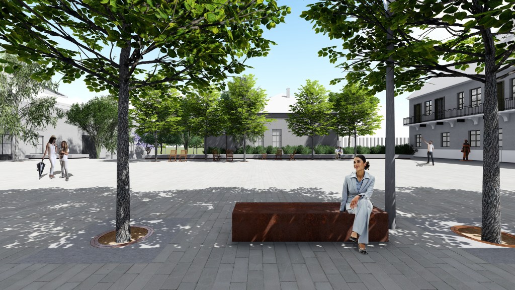 Drugi ambijent sa fiksiranim sedenjem čine tri klupe od kortena, slobodno postavljene u delu trga uz fasadu Palate kulture, nasuprot fontane. I ovde je sedenje grupisano sa zelenilom, tako da su klupe u hladovini I pogodne za korišćenje i leti. Fragmentisana kompozicija sedenja i zelenila u ovom ambijentu ne konkuriše i ne zaklanja od pogleda neobaroknu fasadu Palate, već je dodatno aktivira. Kontrast u materijalizaciji i oblikovanju: beton i korten, masivna linija i slobodno postavljeni elementi; naglašavaju razliku u ambijentima, koji se podjednako dobro uklapaju u jednostavnu klasicisitičku postavku trga – kao na mediteranskim trgovima antičkih gradova gde podjednako dobro žive monumentalni spomenici i pomerljive terase ugostiteljskih lokala.