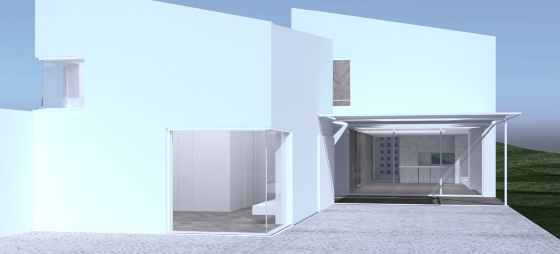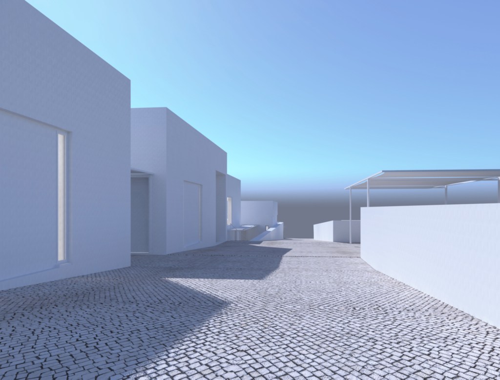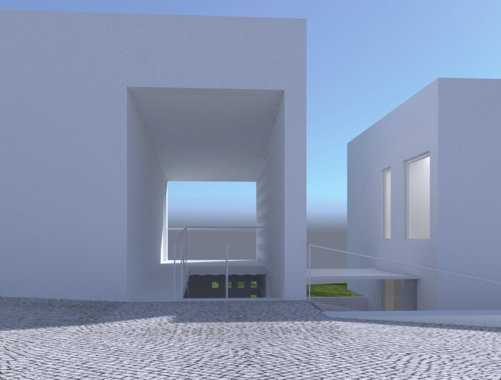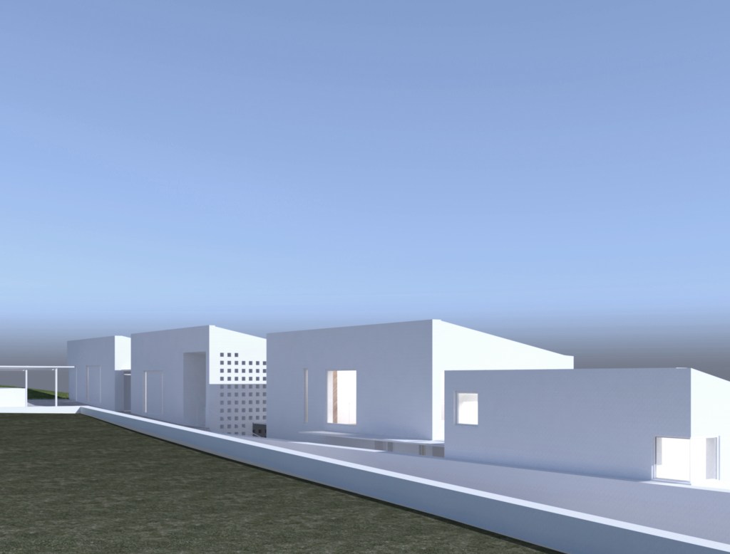 The housing building, although composed of four separate blocks, constitutes a single functional unit. The volumes are integrated into the landscape and follow the natural unevenness of the terrain, allowing the visual and functional enjoyment of the accentuated existing slope. The housing building seeks to have a simple and functional appearance, with the photovoltaic roof orientated to the south. This roof inclination permits better capturing of the solar energy but at the same time defines the identity of the architectural pieces. The facade is plastered and painted in white to facilitate the maintenance of the building. The exterior floor of the house is made of semi-permeable traditional pavement, calçada Portuguesa. The roof consists of Tesla photovoltaic tiles. The window frames are white with the colourless glass. The guards are metallic, painted in white. The shading is removable made from shade-sails over a metallic structure. The materials used in the interior are wood, exposed concrete and natural stone.