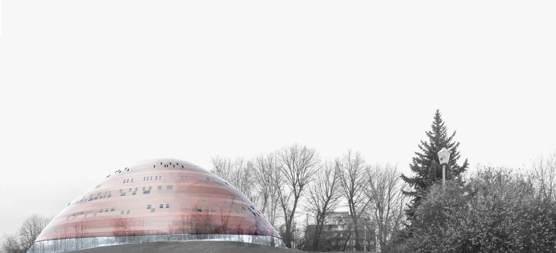 The proposed landscape-building solution is conceptually inspired by hilly natural identity of Lithuania in general and insertion environment of the Tauras Hill in particular. On one hand, the building is designed as natural continuation of the site and on the other it is differing and contrasting element to other urban-architectural objects of Vilnius urban tissue.