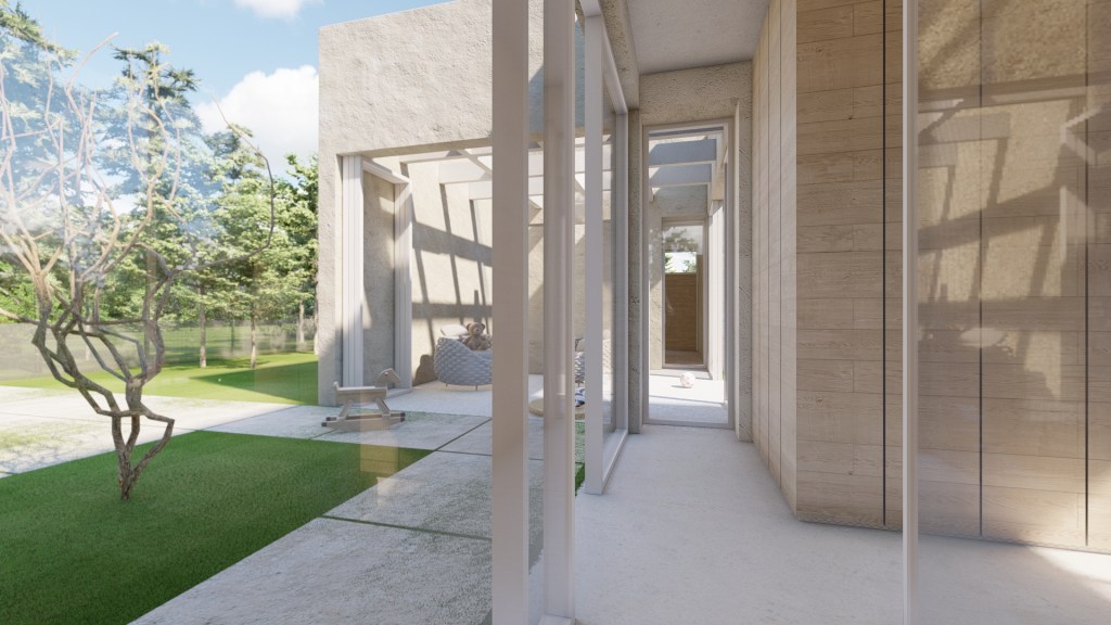 Five different models have been designed to achieve various spatial and visual relationships with the context: one-sided, two-sided, multi-sided, corner connection, and zenithal connection. With identical dimensions and made of concrete, the modules allow for various aggregations and the creation of different temporal modules as well as typologies of single-family houses. They can be organized into regular systems (I, L, U, E, F, O) and irregular spatial configurations adaptable to flat or sloped terrain.