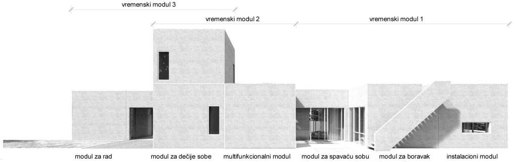 The proposed evolutionary architectural-constructive system is conceived through the repetition of a simple formal-functional module with dimensions of 4.8 × 4.8 × 4.4 meters. The module is inspired by Plato’s cube and minimalist sculptures (e.g., Donald Judd), whose repetition generates multiple formal-functional solutions while preserving the poetic quality of abstract geometric forms.