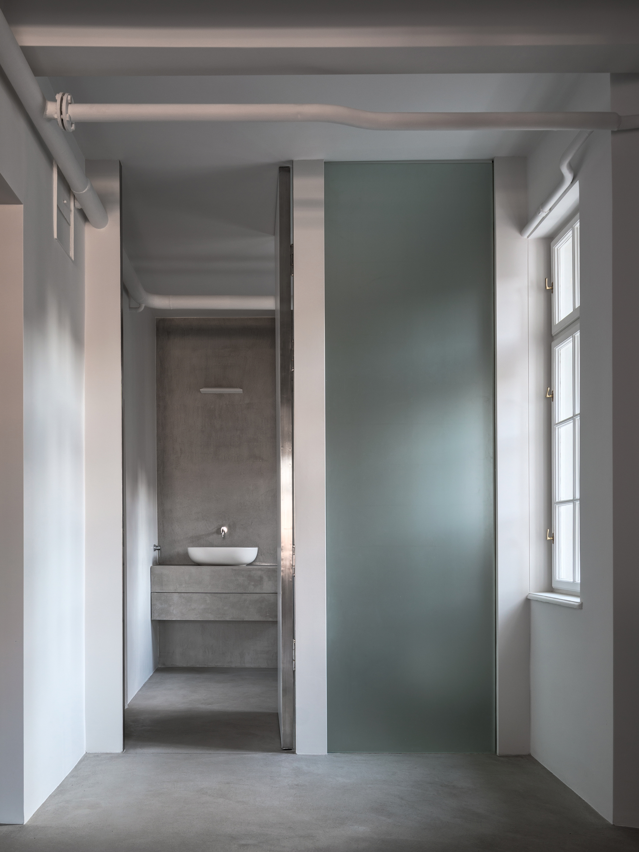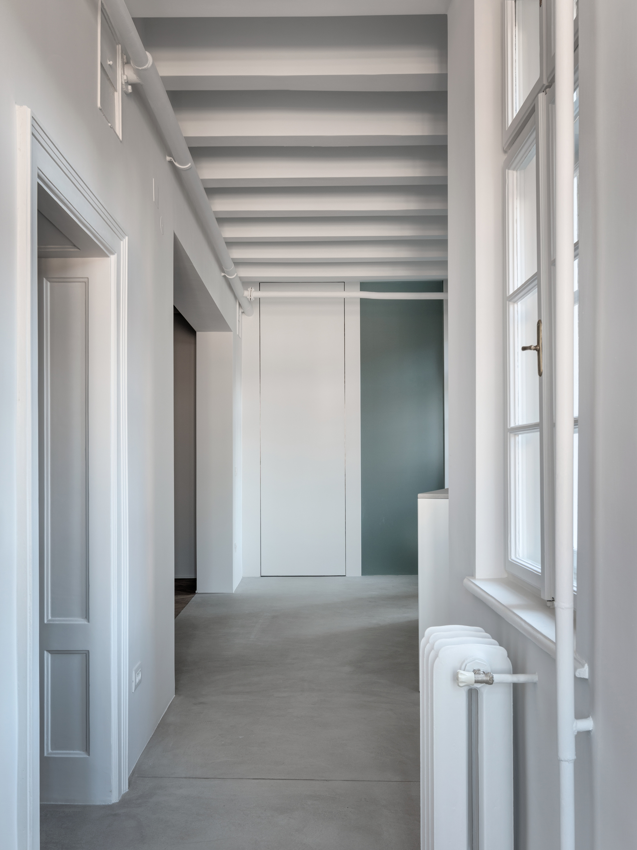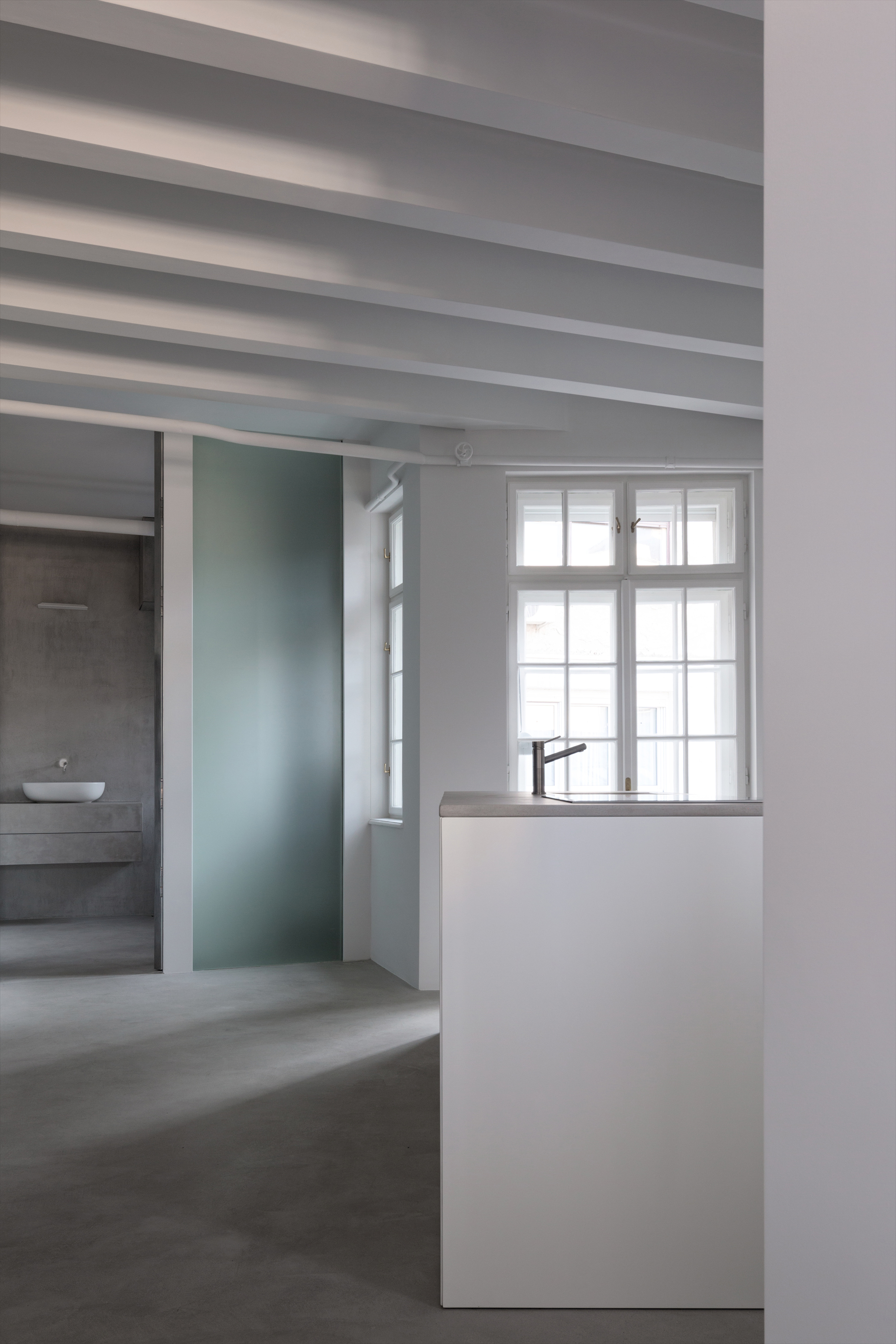 Recognizing all the flaws of the apartment, and taking into account historic value of the interior, wedecided that the focus of the intervention should be on the second element of the apartment, particularly demolishing the heavy walls. This raised the issue of how to separate the bathroom from the kitchen in the most minimal way. This led to the design and installation of a single door (moveable) and single panel of frosted glass (fixed), both 3.2 metres high. This facilitated general circulation in the apartment, as well as provided enhanced views, energy, light and shadow.