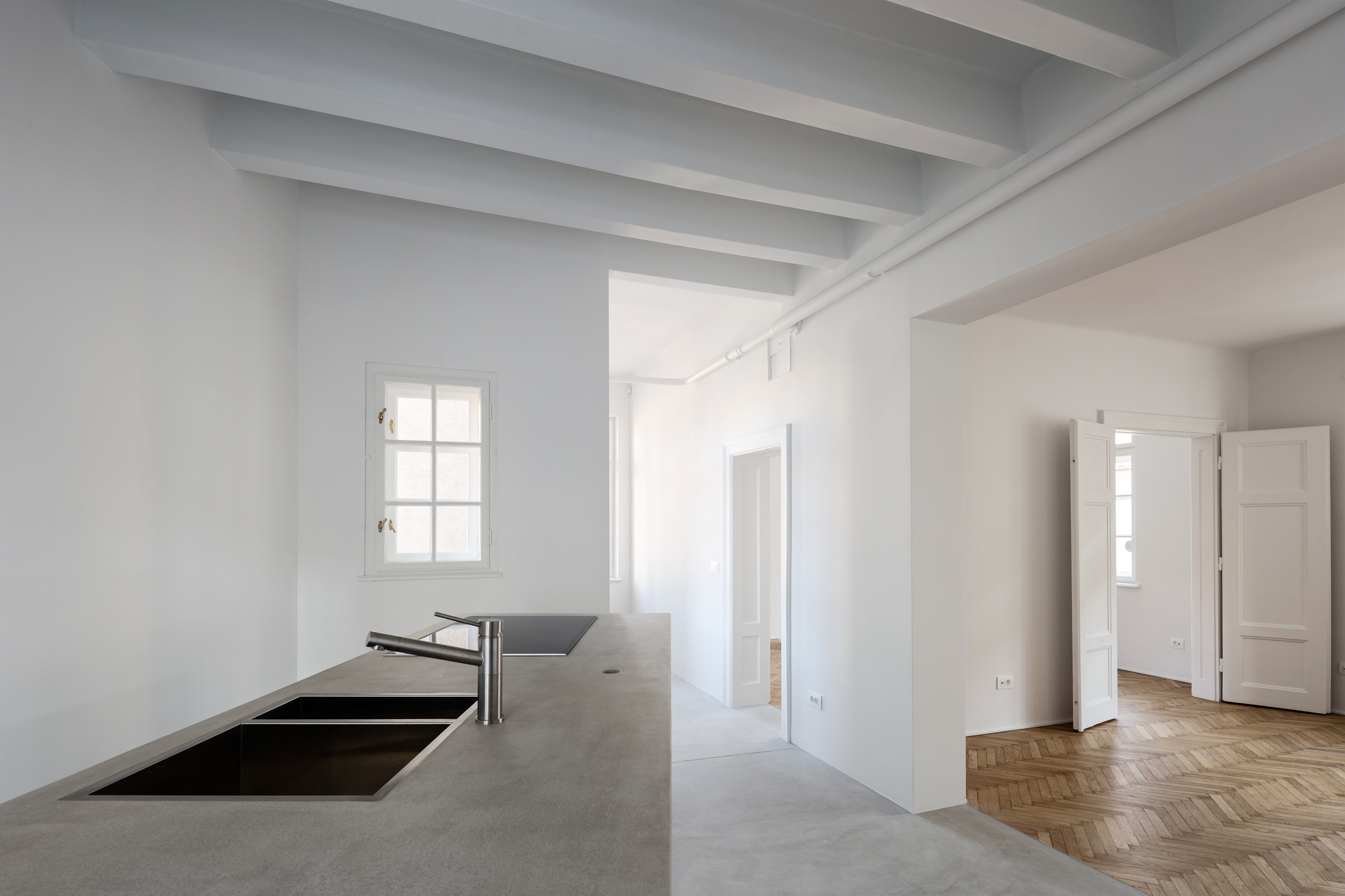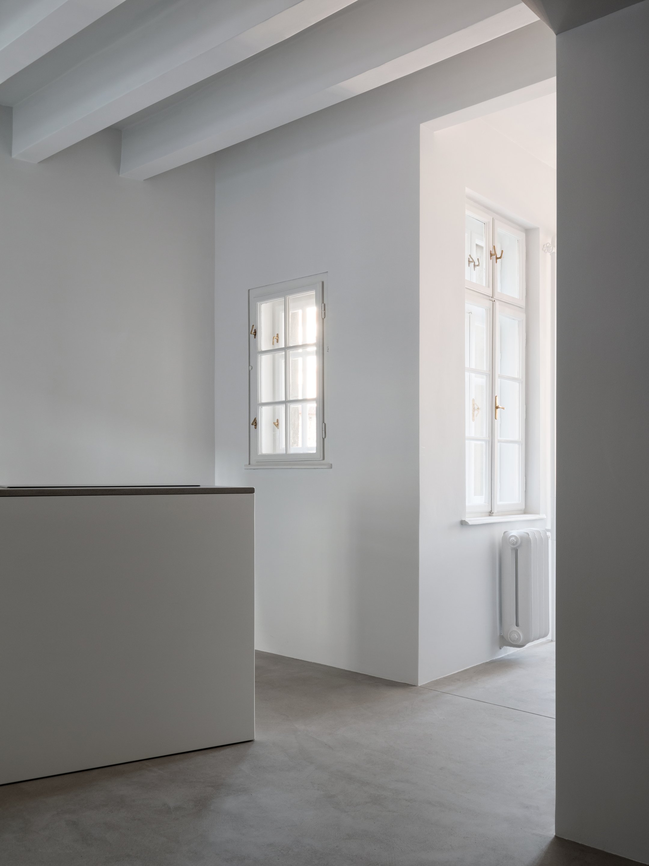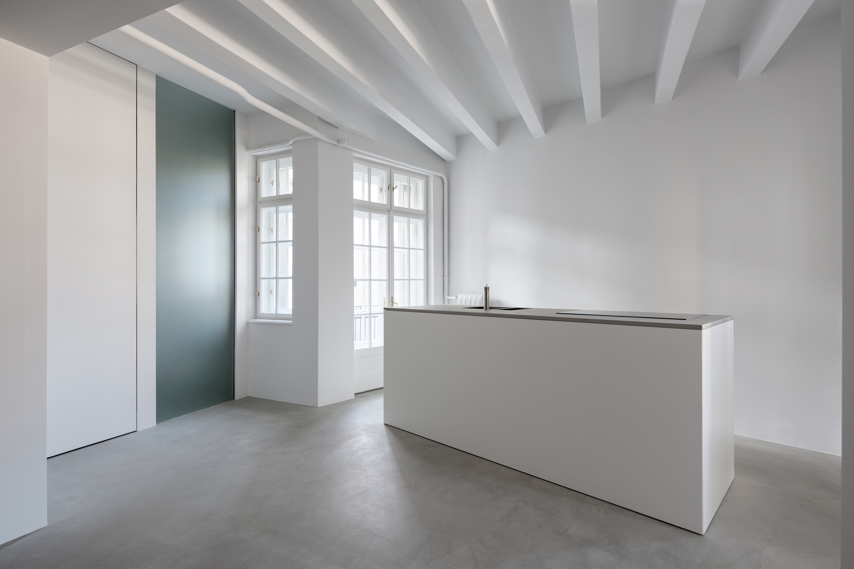 Recognizing all the flaws of the apartment, and taking into account historic value of the interior, wedecided that the focus of the intervention should be on the second element of the apartment, particularly demolishing the heavy walls. This raised the issue of how to separate the bathroom from the kitchen in the most minimal way. This led to the design and installation of a single door (moveable) and single panel of frosted glass (fixed), both 3.2 metres high. This facilitated general circulation in the apartment, as well as provided enhanced views, energy, light and shadow.