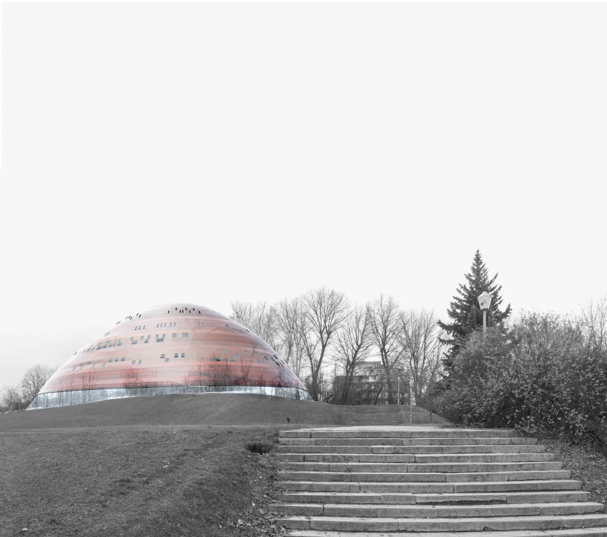 The proposed landscape-building solution is conceptually inspired by hilly natural identity of Lithuania in general and insertion environment of the Tauras Hill in particular. On one hand, the building is designed as natural continuation of the site and on the other it is differing and contrasting element to other urban-architectural objects of Vilnius urban tissue.